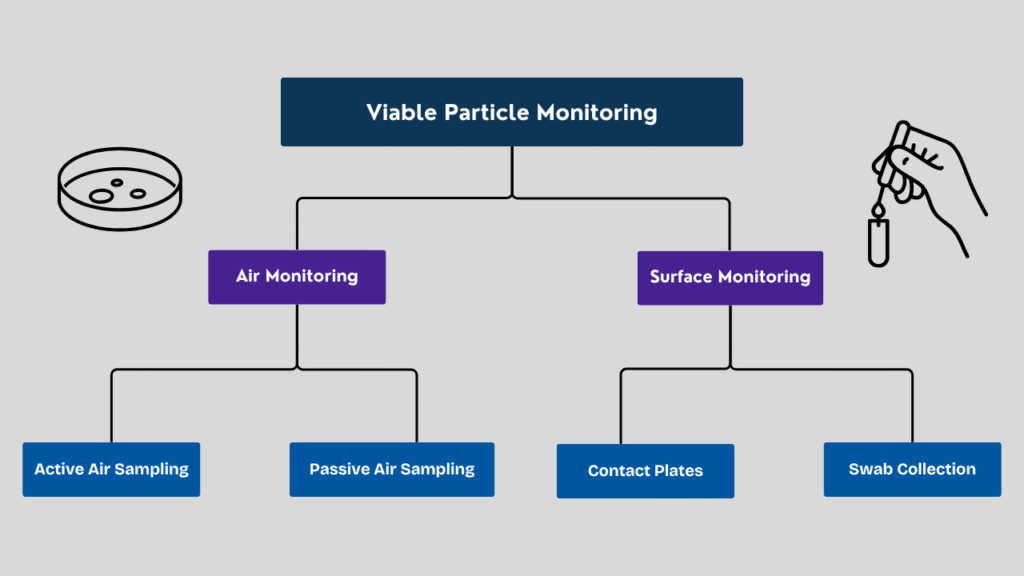 There are two different types of viable monitoring. Air monitoring and surface monitoring. Air monitoring can be conducted using both active and passive air sampling methods. Surface monitoring can be conducted using contact plates and swab sampling methods.