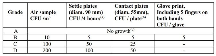 These are the specifications for viable monitoring in different grades, as outlined in the regulatory guidelines.